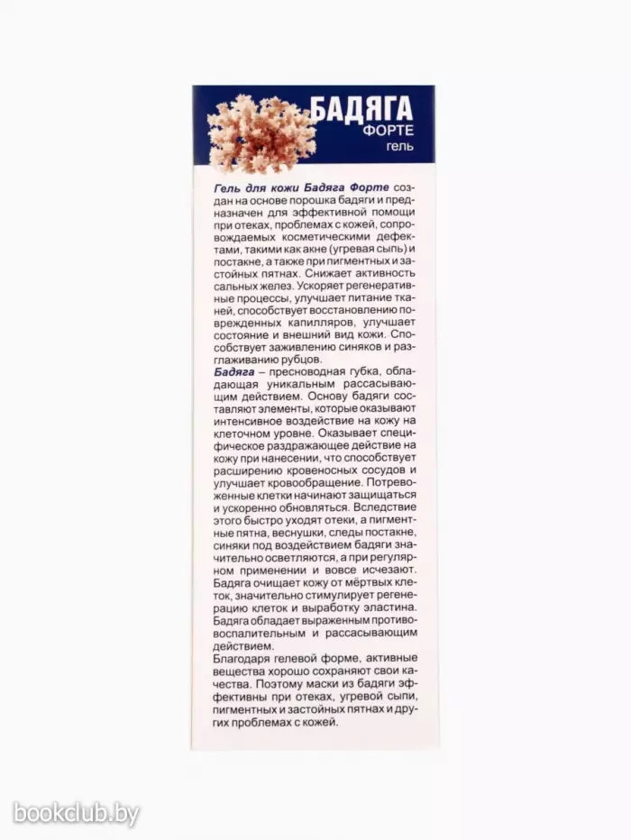 -Бадяга - пресноводная губка, обладающая уникальным рассасывающим, бактерицидным и отшелушивающим действием. Традиционное высокоэффективное средство для быстрого заживления ушибов, кровоподтёков, гематом, снижения болевых ощущений. Трансдермальные (проводящие) свойства бадяги значительно усиливают активность натуральных компонентов геля. Действие основано на механическом стимулировании микроциркуляции. Скелет бадяги состоит из петлистой сети игл кремнезема, связанных между собой органическим веществом - спонгином, а также фосфатов, карбонатов и органических веществ.Основу бадяги составляет элемент кремнезем, который оказывает интенсивное действие на кожу на клеточном уровне. Очищает кожу мёртвых клеток, значительно стимулирует регенерацию клеток и выработки эластина.Кремнезем в теле губки образует целую сеть мелких иголочек, которые оказывают раздражающее действие на кожу при нанесении, что способствует расширению кровеносных сосудов и улучшает кровообращение. Потревоженные клетки начинают защищаться и ускоренно регенерироваться. Вследствие этого пигментные пятна , веснушки следы постакне , синяки под воздействием бадяги значительно осветляют, а при регулярном применение и вовсе исчезают. Иголочки в губке скрепляются между собой уникальным природным, белком спонгинином, который обладает выраженным бактерицидным, противовоспалительным, рассасывающим и даже обезболивающим действием. Поэтому маски из бадяги эффективны при угревой сыпи и воспалениях кожи.