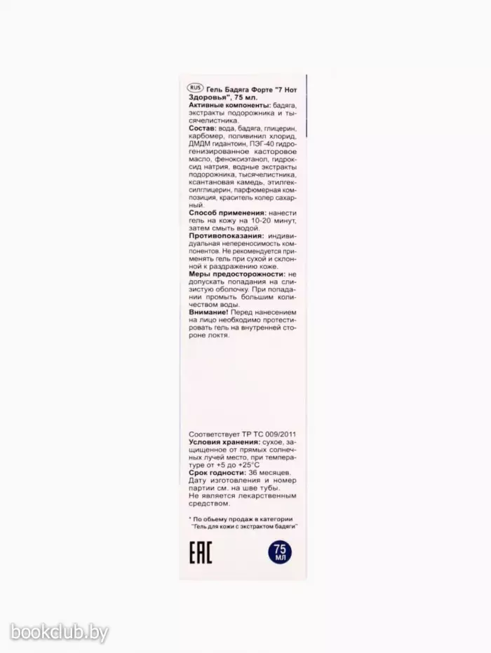 7 НОТ ЗДОРОВЬЯ БАДЯГА ФОРТЕ ГЕЛЬ - гелеобразная текстура от прозрачного до светло-бежевого цвета с умеренно-выраженным запахом