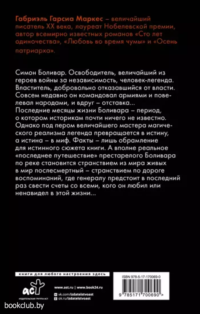 Симон Боливар. Освободитель, величайший из героев войны за независимость, человек-легенда. Властитель, добровольно отказавшийся от власти. Совсем недавно он командовал армиями и повелевал народами и вдруг – отставка… Последние месяцы жизни Боливара — период, о котором историкам почти ничего не известно. Однако под пером величайшего мастера магического реализма легенда превращается в истину, а истина – в миф. Факты – лишь обрамление для истинного сюжета книги. А вполне реальное «последнее путешествие» престарелого Боливара по реке становится странствием из мира живых в мир послесмертный – странствием по дороге воспоминаний, где генералу предстоит в последний раз свести счеты со всеми, кого он любил или ненавидел в этой жизни…