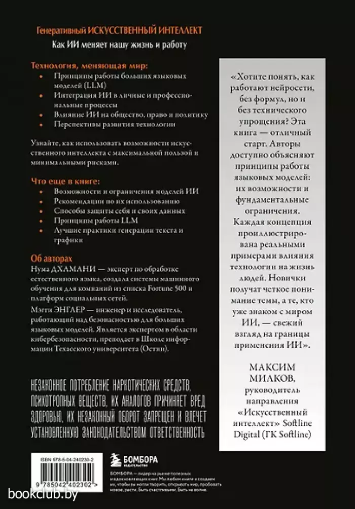 НЕЗАКОННОЕ ПОТРЕБЛЕНИЕ НАРКОТИЧЕСКИХ СРЕДСТВ, ПСИХОТРОПНЫХ ВЕЩЕСТВ, ИХ АНАЛОГОВ ПРИЧИНЯЕТ ВРЕД ЗДОРОВЬЮ, ИХ НЕЗАКОННЫЙ ОБОРОТ ЗАПРЕЩЕН И ВЛЕЧЕТ УСТАНОВЛЕННУЮ ЗАКОНОДАТЕЛЬСТВОМ ОТВЕТСТВЕННОСТЬ.Технология, меняющая мир: • Принципы работы больших языковых моделей (LLM). • Интеграция ИИ в личные и профессиональные процессы. • Влияние ИИ на общество, право и политику. • Перспективы развития технологии. Узнайте, как использовать возможности искусственного интеллекта с максимальной пользой и минимальными рисками. Что еще в книге: • Возможности и ограничения моделей ИИ. • Рекомендации по их использованию. • Способы защиты себя и своих данных. • Принципы работы LLM. • Лучшие практики генерации текста и графики. Отзыв «Хотите понять, как работают нейросети, без формул, но и без технического упрощения? Эта книга — отличный старт. Авторы доступно объясняют принципы работы языковых моделей: их возможности и фундаментальные ограничения. Каждая концепция проиллюстрирована реальными примерами влияния технологии на жизнь людей. Новички получат четкое понимание темы, а те, кто уже знаком с миром ИИ, — свежий взгляд на границы применения ИИ». — Максим МИЛКОВ, руководитель направления «Искусственный интеллект» Softline Digital (ГК Softline) Об авторах Нума ДХАМАНИ — эксперт по обработке естественного языка, создала системы машинного обучения для компаний из списка Fortune 500 и платформ социальных сетей. Мэгги ЭНГЛЕР — инженер и исследователь, работающий над безопасностью для больших языковых моделей. Является экспертом в области кибербезопасности, преподает в Школе информации Техасского университета (Остин). Книги издательства «ЭКСМО» из серии «Путеводитель по GPT и AI» станут прекрасным дополнением вашей библиотеки. Для вашего удобства при оформлении заказа по телефону назовите код товара: 416968