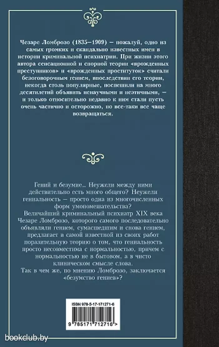 Гений и безумие… Неужели между ними действительно есть много общего? Неужели гениальность – просто одна из многочисленных форм умопомешательства? Величайший криминальный психиатр XIX века Чезаре Ломброзо, которого самого последовательно объявляли гением, сумасшедшим и снова гением, предлагает в самой известной из своих работ поразительную теорию о том, что гениальность просто несовместима с нормальностью, - причем с нормальностью не в бытовом, а в чисто клиническом смысле слова. Так в чем же, по мнению Ломброзо, заключается «безумство гениев»?