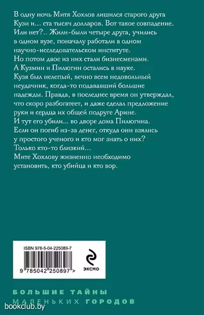 В одну ночь Митя Хохлов лишился старого друга Кузи и... ста тысяч долларов. Вот такое совпадение. Или нет?.. Жили-были четыре друга, учились в одном вузе, поначалу работали в одном научно-исследовательском институте. Но потом двое из них стали бизнесменами. А Кузьмин и Пилюгин остались в науке. Кузя был нелепый, вечно всем недовольный неудачник, когда-то подававший большие надежды. Правда, в последнее время он утверждал, что скоро разбогатеет, и даже сделал предложение руки и сердца их общей подруге Арине. И тут его убили… во дворе дома Пилюгина. Если он погиб из-за денег, откуда они взялись у простого ученого и кто мог знать о них? Только кто-то близкий... Мите Хохлову жизненно необходимо установить — кто убийца и кто вор?