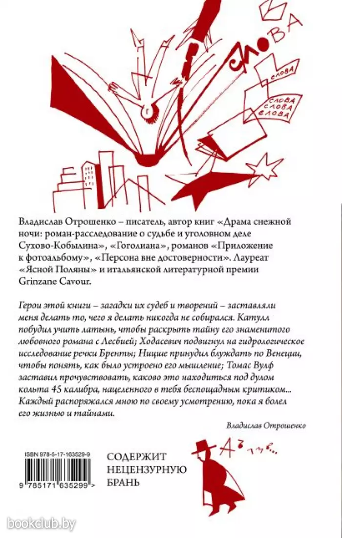 "Герои этой книги — загадки их судеб и творений — заставляли меня делать то, чего я делать никогда не собирался. Катулл побудил учить латынь, чтобы раскрыть тайну его знаменитого любовного романа с Лесбией; Ходасевич подвигнул на гидрологическое исследование речки Бренты; Ницше принудил блуждать по Венеции, чтобы понять, как было устроено его мышление; Томас Вулф заставил прочувствовать, каково это находиться под дулом кольта 45 калибра, нацеленного в тебя беспощадным критиком... Каждый распоряжался мною по своему усмотрению, пока я болел его жизнью и тайнами".