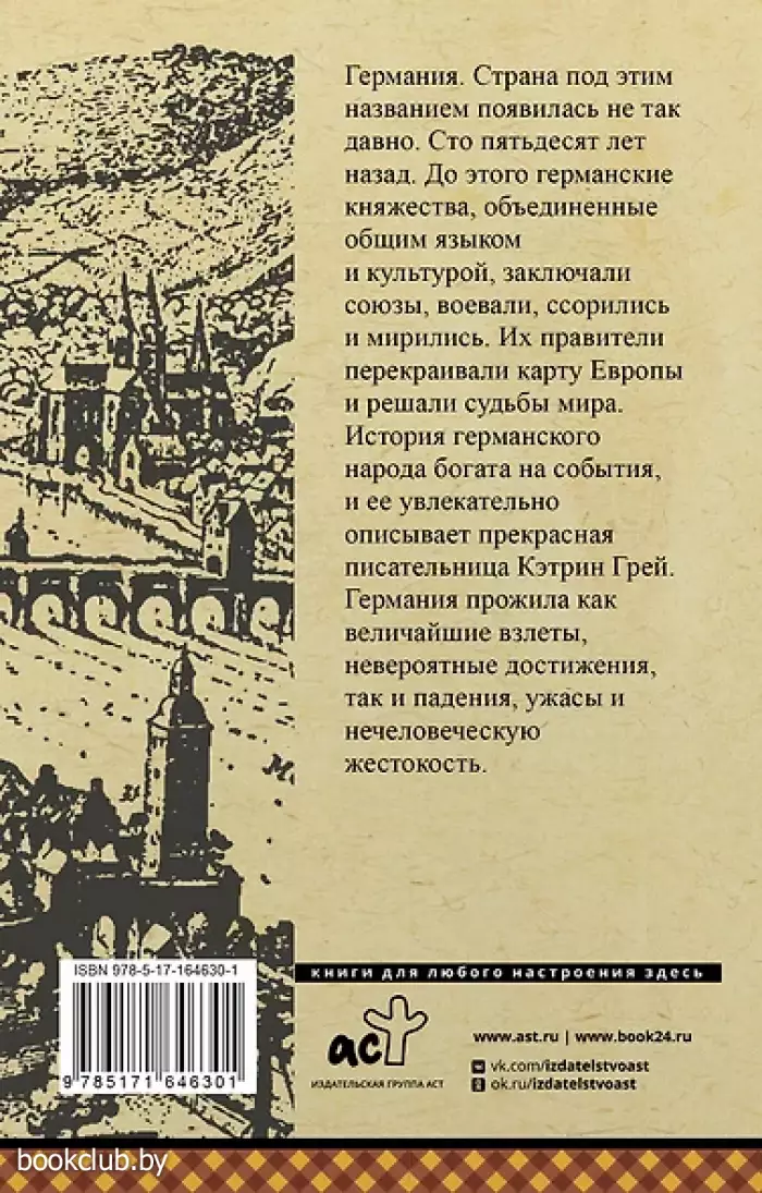 Германия. Страна под этим названием появилась не так давно. Сто пятьдесят лет назад. До этого германские княжества, объединённые общим языком и культурой, заключали союзы, воевали, ссорились и мирились. Их правители перекраивали карту Европы и решали судьбы мира. История германского народа богата на события, и ее увлекательно описывает прекрасная писательница Кэтрин Грэй. Германия прожила как величайшие взлеты, невероятные достижения, так и падения, ужасы и нечеловеческую жестокость.