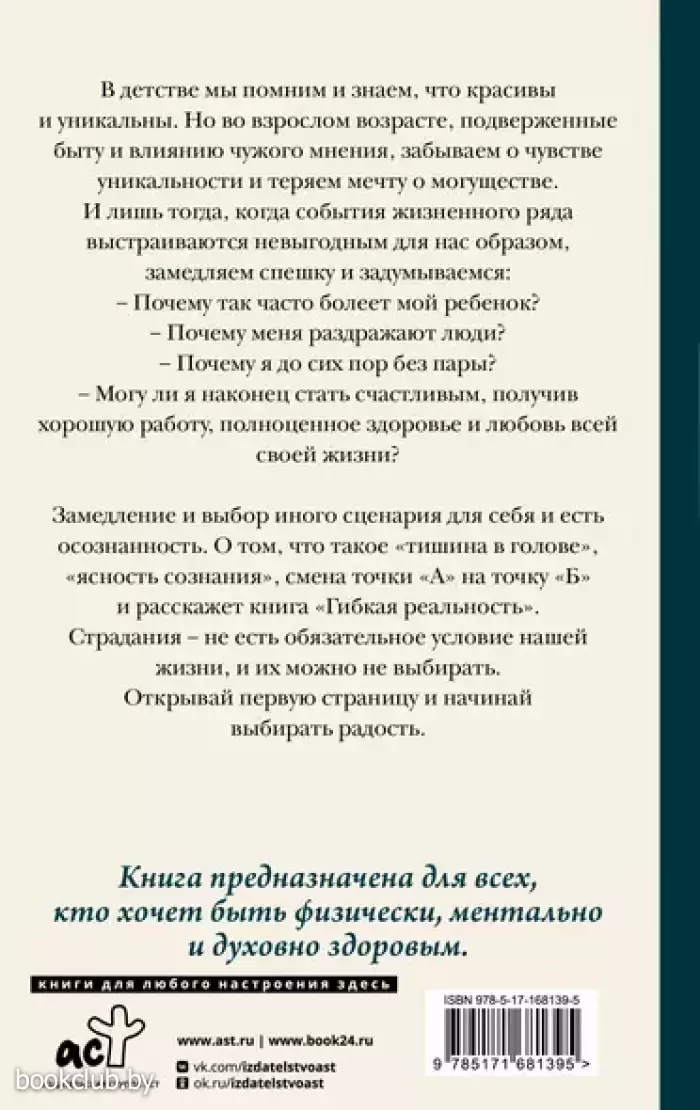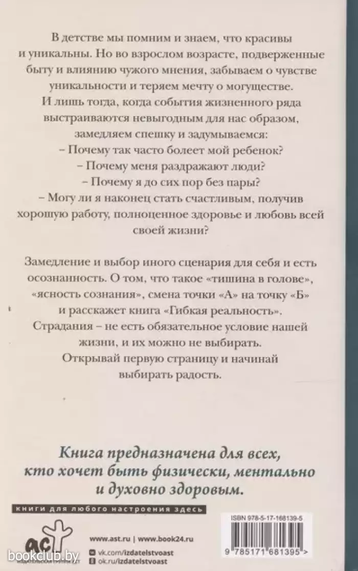 Замедление и выбор иного сценария для себя и есть осознанность. О том, что такое «тишина в голове», «ясность сознания», смена точки «А» на точку «Б» и расскажет книга «Гибкая Реальность». Страдания – не есть обязательное условие нашей жизни, и их можно не выбирать. Отрывайте первую страницу и начните выбирать радость.