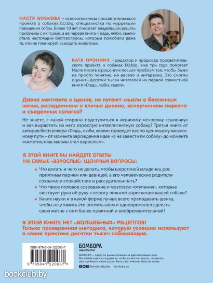 Давно мечтаете о щенке, но пугают мысли о бессонных ночах, разодранном в клочья диване, испорченном паркете и съеденных сапогах? Не знаете, с какой стороны подступиться к игривому меховому «сыночку» и как вырастить их него взрослую интеллигентную собаку? Третья книга от авторов бестселлера «Гладь, люби, хвали» проведет вас по щенячьему жизненному пути — от момента зарождения идеи «А не завести ли собаку» до момента «Кажется, наш малыш стал взрослым».