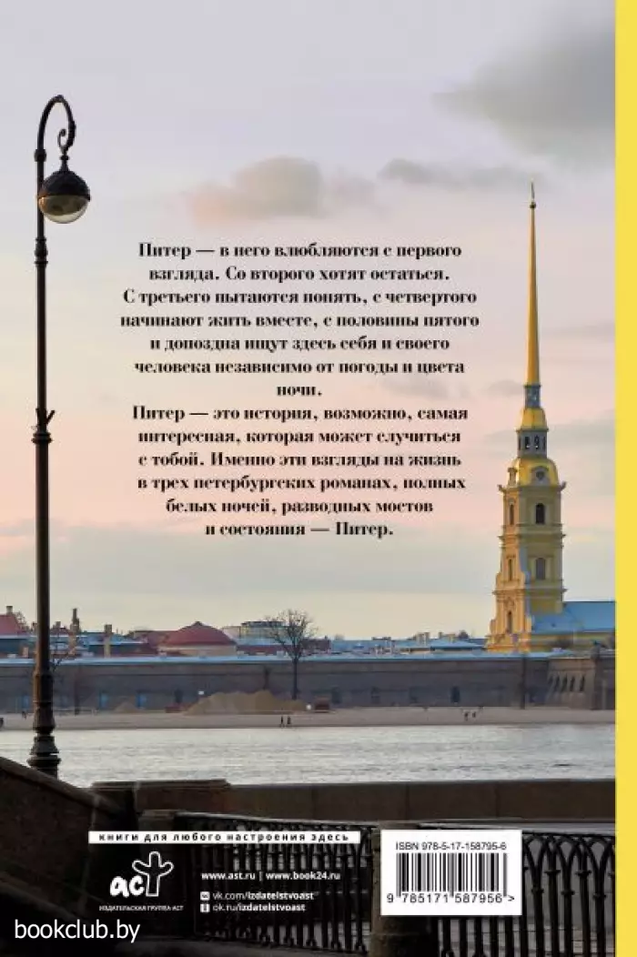 Питер — в него влюбляются с первого взгляда. Со второго хотят остаться. С третьего пытаются понять, с четвертого начинают жить вместе, с половины пятого и допоздна ищут здесь себя и своего человека независимо от погоды и цвета ночи. Питер — это история, возможно самая интересная, которая может случиться с тобой. Именно эти взгляды на жизнь в трех Петербургских романах, полных белых ночей, разводных мостов и состояния — Питер.