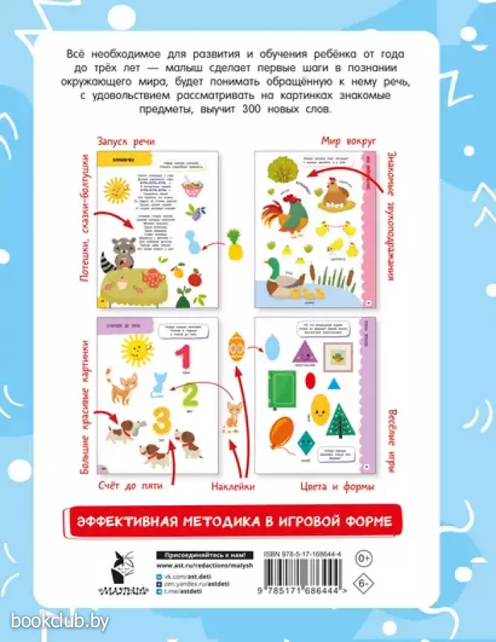 "Годовой курс занятий для детей от 1 до 3 лет. 64 наклейки" — это развивающее пособие для запуска речи, развития внимания, памяти, мелкой моторики, координации движений и логического мышления. Все необходимое для развития и обучения ребенка от года до трёх лет собрано в этой книге: кроха сделает первые шаги в познании окружающего мира, будет понимать обращенную к нему речь, с удовольствием рассматривать на картинках домашних и диких животных, потренирует пальчики, сможет узнавать и называть цвета и геометрические формы, освоит счёт до пяти, познакомится с потешками, пестушками и сказками, выучит 300 новых слов и научится строить фразы. Это идеальная книга-обучалка для самых маленьких: 64 красочные наклейки, много интересных игр и заданий, цветные картинки — и ни одной скучной страницы!