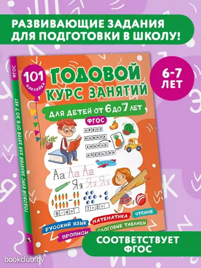 Книга "Годовой курс занятий для детей от 6 до 7 лет. 101 наклейка" — отличный выбор заботливых родителей. Курс соответствует требованиям нового Федерального государственного образовательного стандарта дошкольного образования, поэтому гарантирует эффективное обучение и полноценное развитие ребёнка. Малыш потренируется писать, читать и пересказывать, пополнит словарный запас, освоит слоговые таблицы, поиграет в игры с буквами и звуками, познакомится с цифрами и математическими знаками, научится решать простые примеры и задачи.