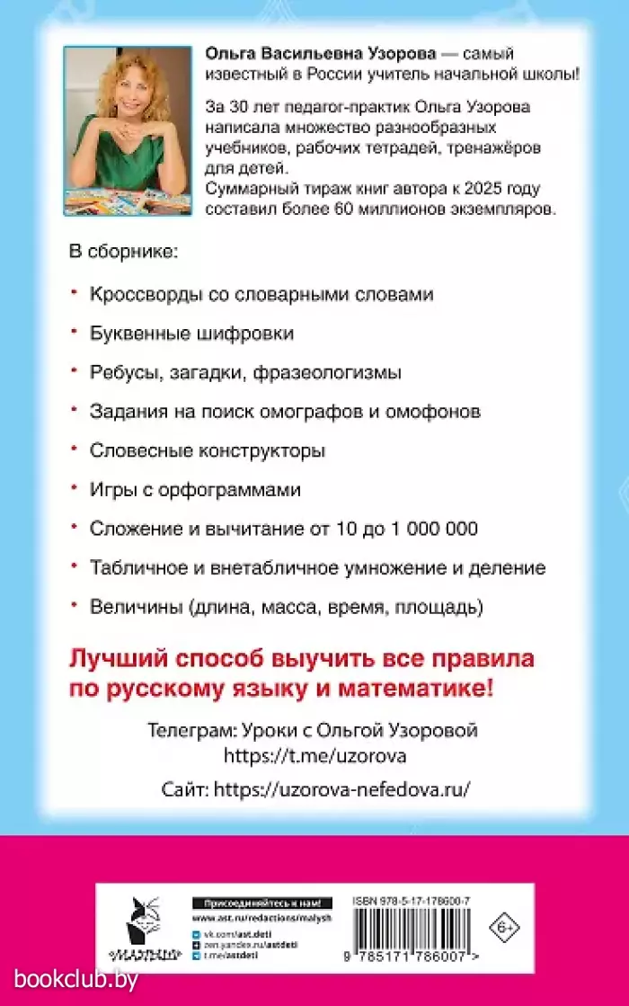 Полезное пособие «Головоломки: словарные, орфографические, математические. 1-4 классы» основано на эффективной авторской методике О. В. Узоровой —самого известного в нашей стране учителя начальных классов. На 128 страницах книги представлены кроссворды со словарными словами, буквенные шифровки, ребусы, загадки, конструкторы слов, игры с цифрами, числовые кроссворды, хитрые задачки и множество других занимательных заданий, справившись с которыми ребёнок выучит все правила по русскому языку и математике. Достаточно заниматься по 10 минут в день, чтобы повысить грамотность, расширить словарный запас, развить навык счёта. Пособие подходит для занятий дома и в классе по всем федеральным программам начальной школы.