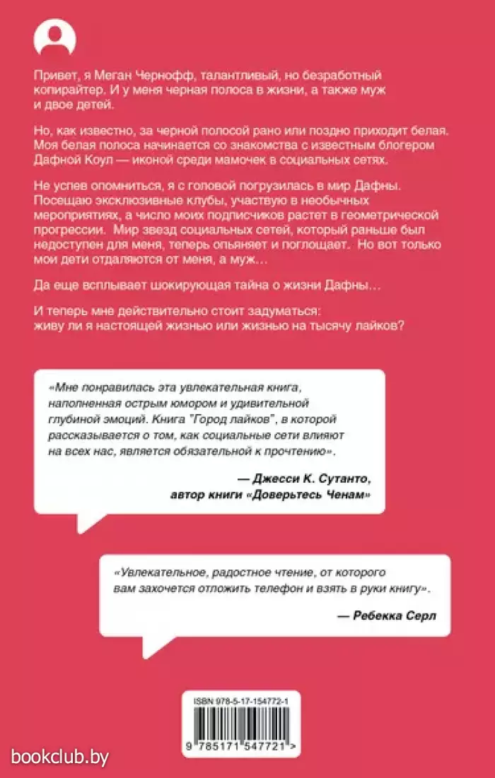 Привет, я Меган Чернофф, талантливый, но безработный копирайтор. И у меня черная полоса в жизни, а также муж и двое детей. Но, как известно, за черной полосой рано или поздно приходит белая. Моя белая полоса начинается со знакомства с известным блогером Дафной Коул: иконой среди мамочек в социальных сетях. Не успев опомниться, я с головой погрузилась в мир Дафны. Посещаю эксклюзивные клубы, участвую в необычных мероприятиях, а число моих подписчиков растет в геометрической прогрессии. Мир звезд социальных сетей, который раньше был недоступен для меня, теперь опьяняет и поглощает. Но вот только мои дети отдаляются от меня, а муж… Да еще всплывает шокирующая тайна о жизни Дафны… И теперь мне действительно стоит задуматься: живу ли я настоящей жизнью или жизнью на тысячу лайков?