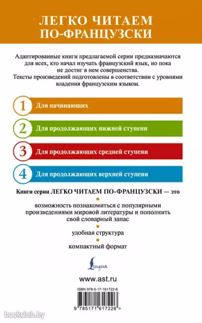 Книга от издательства «АСТ», входящая в серию «Легко читаем по-французски», принесет массу положительных впечатлений от прочтения и займет достойное место в вашей библиотеке. Для вашего удобства при оформлении заказа по телефону назовите код товара: 411753