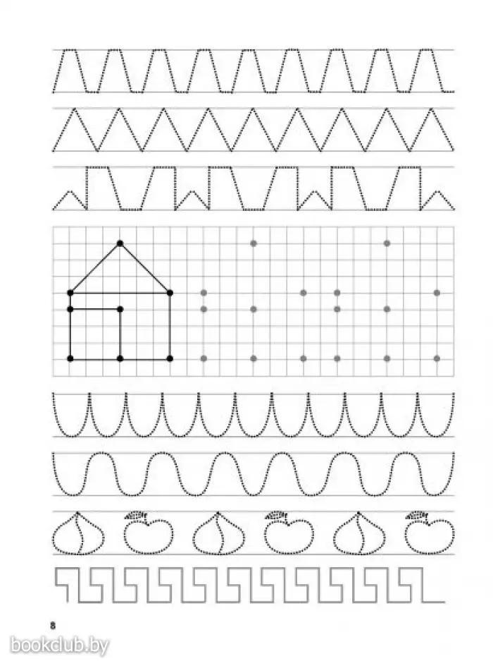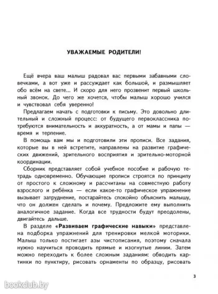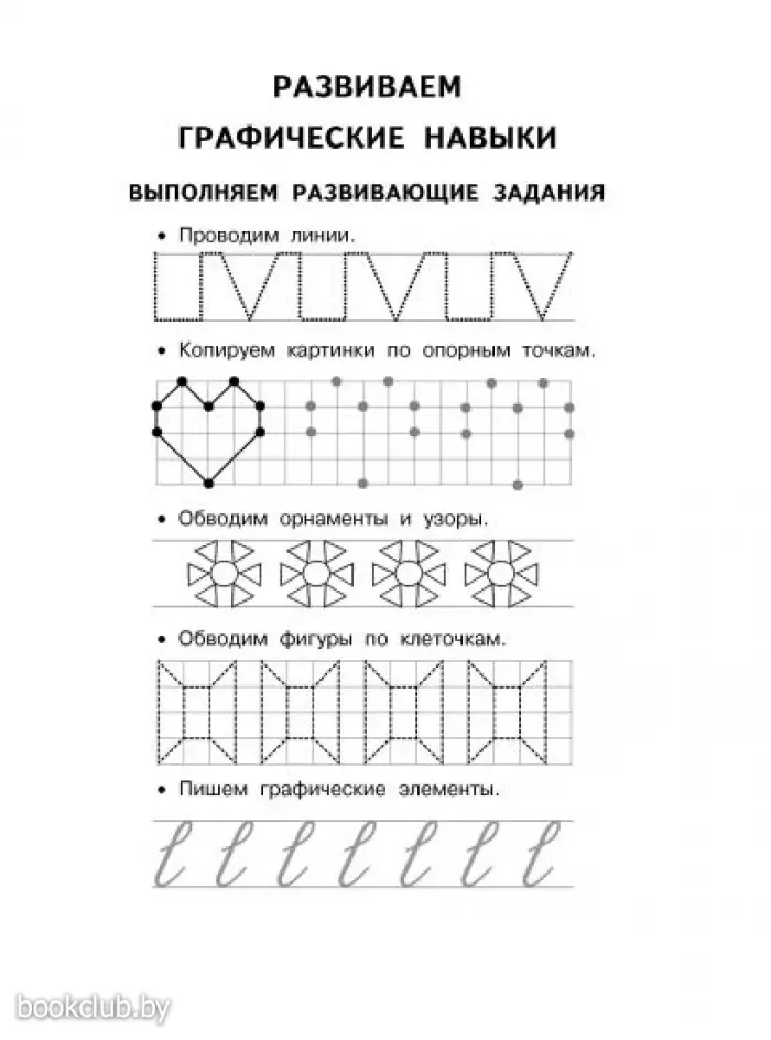 Прописи включают блок графических занятий для подготовки руки к письму. Ребенку предлагается проводить линии, рисовать по клеточкам и точкам.