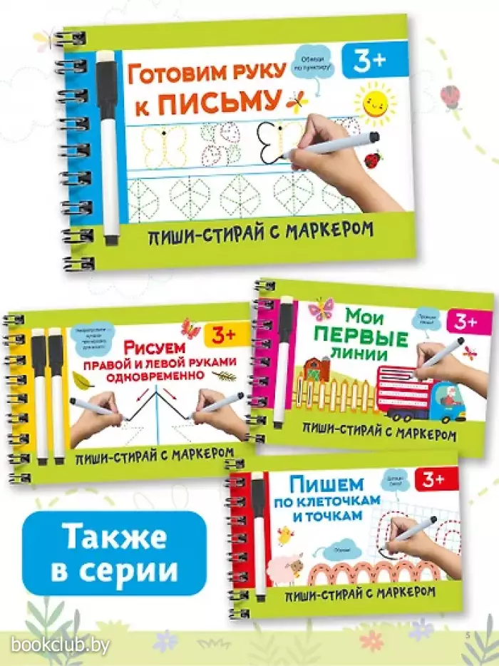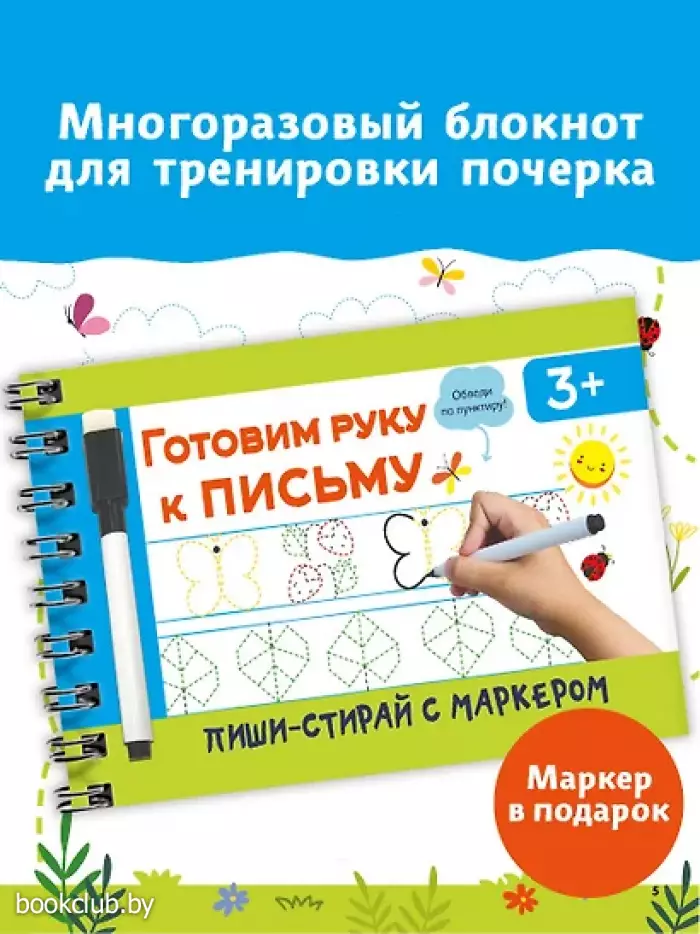 Многоразовая тетрадь на спирали "Готовим руку к письму" — замечательная книга, которая поможет ребёнку научиться держать маркер, развить мелкую моторику и подготовить руку к письму. Все страницы ламинированы, маркер стирается одним движением. Можно не бояться ошибок, пробовать писать снова и снова. Удобный формат книги — А5, поместится и в мамину сумку, и в детский рюкзачок.