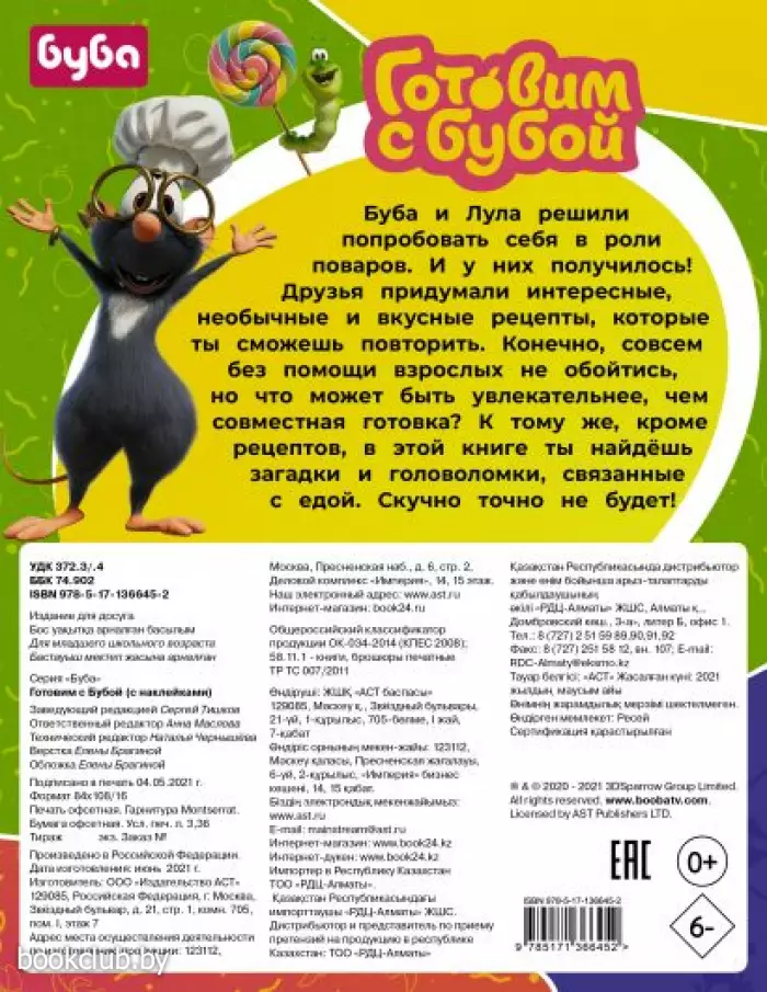 Книга со съедобными рецептами, играми и наклейками от Бубы и его друзей. Внутри простые, а главное интересные рецепты для детей и их родителей. Шаги и ингредиенты расписаны, есть красивые картинки, где изображен финальный результат. А еще внутри книги задания: вкусный счет, лабиринты, поиск отличий, раскраски, кроссворд, ребусы, загадки. Для некоторых заданий понадобятся наклейки – они входят в комплект.