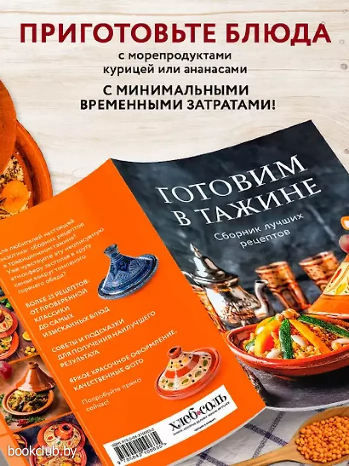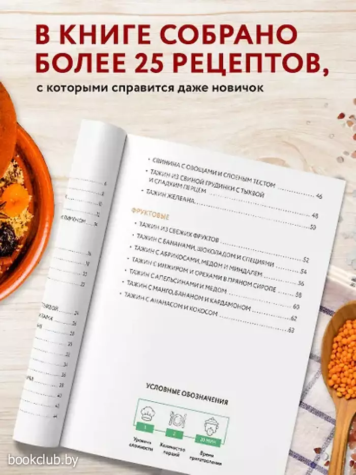 - Более 25 уникальных рецептов для тажины: мясо, птица, овощи, бобовые и ароматные соусы.