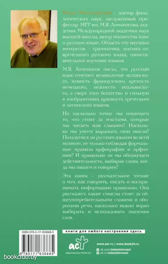Игорь Милославский — доктор филологических наук, заслуженный профессор МГУ им. М.В. Ломоносова, академик Международной академии наук высшей школы, автор множества книг о русском языке. Область его научных интересов — грамматика, лексика современного русского языка, сопоставительное изучение языков. М.В. Ломоносов писал, что русский язык сочетает великолепие испанского, живость французского, крепость немецкого, нежность итальянского, а сверх того богатство и сильную в изображениях краткость греческого и латинского языков. Но насколько точно мы понимаем то, что стоит за текстами, которые мы читаем или слышим? Насколько мы умеем выражать свои мысли? Пользуемся ли русским языком во всей полноте, не только соблюдая формальные правила орфографии и орфоэпии? И "правильно" ли мы обозначаем действительность, выбирая слова, когда мы пишем и говорим? Эта книга – увлекательное чтение о том, как говорить, писать и воспринимать информацию правильно. Она расскажет, какие смыслы стоят за общеупотребительными словами и оборотами речи, насколько важно верно выбирать и использовать значения слов.