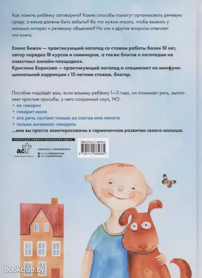 Ищете инструкцию, как помочь ребёнку заговорить? Это издание для вас! Практикующие логопеды с многолетним опытом, блогеры Елена Бежан и Кристина Борисова создали пособие, которое станет практическим руководством по созданию речевой среды. Эта книга подойдёт вам, если вашему ребёнку 1-3 года, но он не говорит или говорит мало, его речь состоит только из слогов или лепета, а также если вы просто заинтересованы во всестороннем развитии малыша. На страницах пособия теоретический материал для родителей чередуется с заданиями для детей, которые можно выполнять прямо в книге. Материал расположен от простого к сложному. В конце находится приложение, которое можно вырезать и играть в развивающие игры так, как вам захочется.
