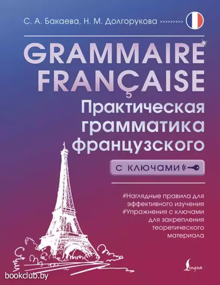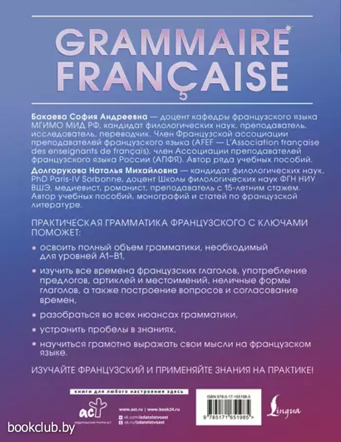 Бакаева София Андреевна — доцент кафедры французского языка МГИМО МИД РФ, кандидат филологических наук, преподаватель, исследователь, переводчик. Член Французской ассоциации преподавателей французского языка (AFEF — L'Association française des enseignants de français), член Ассоциации преподавателей французского языка России (АПФЯ). Автор ряда учебных пособий. Долгорукова Наталья Михайловна — кандидат филологических наук, PhD Paris-IV Sorbonne, доцент Школы филологических наук ФГН НИУ ВШЭ, медиевист, романист, преподаватель с 15-летним стажем. Автор ряда учебных пособий, монографий и статей по французской литературе. В этом издании представлен полный объем грамматики французского языка уровней А1–В1, даны все базовые правила, подробно рассмотрены части речи и их особенности, также уделено внимание фонетике и синтаксису. Теоретический материал сопровождается упражнениями, для большей части которых даны ответы. Великолепное издание, без которого не обойтись при изучении французского языка!