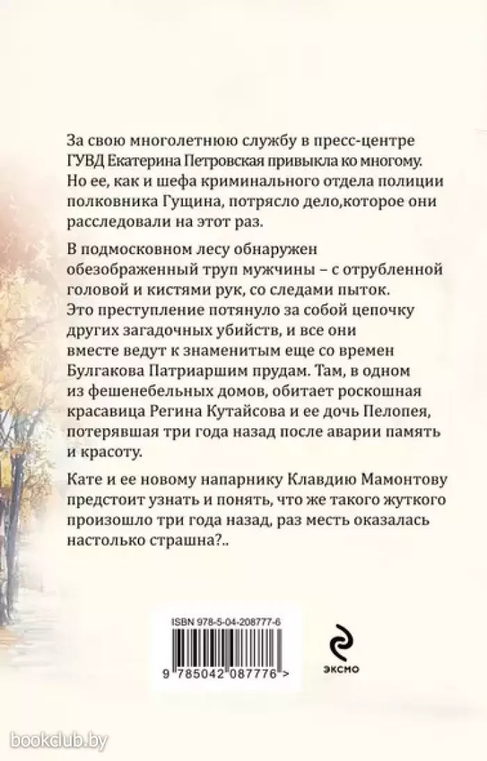 За свою многолетнюю службу в Пресс-центре ГУВД Екатерина Петровская привыкла ко многому. Но ее, как и шефа криминального отдела полиции полковника Гущина, потрясло дело, которое они расследовали на этот раз. В подмосковном лесу обнаружен обезображенный труп мужчины — с отрубленной головой и кистями рук, со следами пыток. Это преступление потянуло за собой цепочку других загадочных убийств, и все они вместе ведут к знаменитым еще со времен Булгакова Патриаршим прудам. Там, в одном из фешенебельных домов, обитают роскошная красавица Регина Кутайсова и ее дочь Пелопея, потерявшая три года назад после аварии память и красоту. Кате и ее новому напарнику Клавдию Мамонтову предстоит узнать и понять, что же такого жуткого произошло три года назад, раз месть оказалась настолько страшна?..