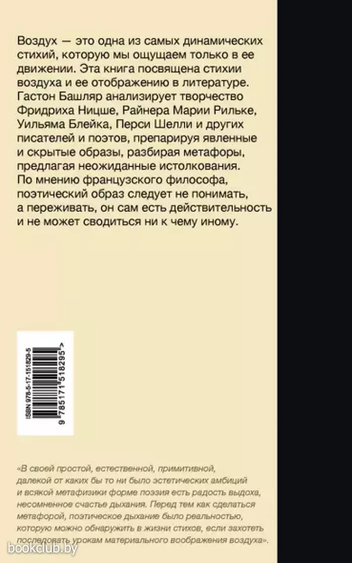 Воздух — это одна из самых динамических стихий, которую мы ощущаем только в ее движении. Эта книга посвящена стихии воздуха и ее отображению в литературе. Гастон Башляр анализирует творчество Фридриха Ницше, Райнера Марии Рильке, Уильяма Блейка, Перси Шелли и других писателей и поэтов, препарируя явленные и скрытые образы, разбирая метафоры, предлагая неожиданные истолкования. По мнению французского философа, поэтический образ следует не понимать, а переживать, он сам есть действительность и не может сводиться ни к чему иному.