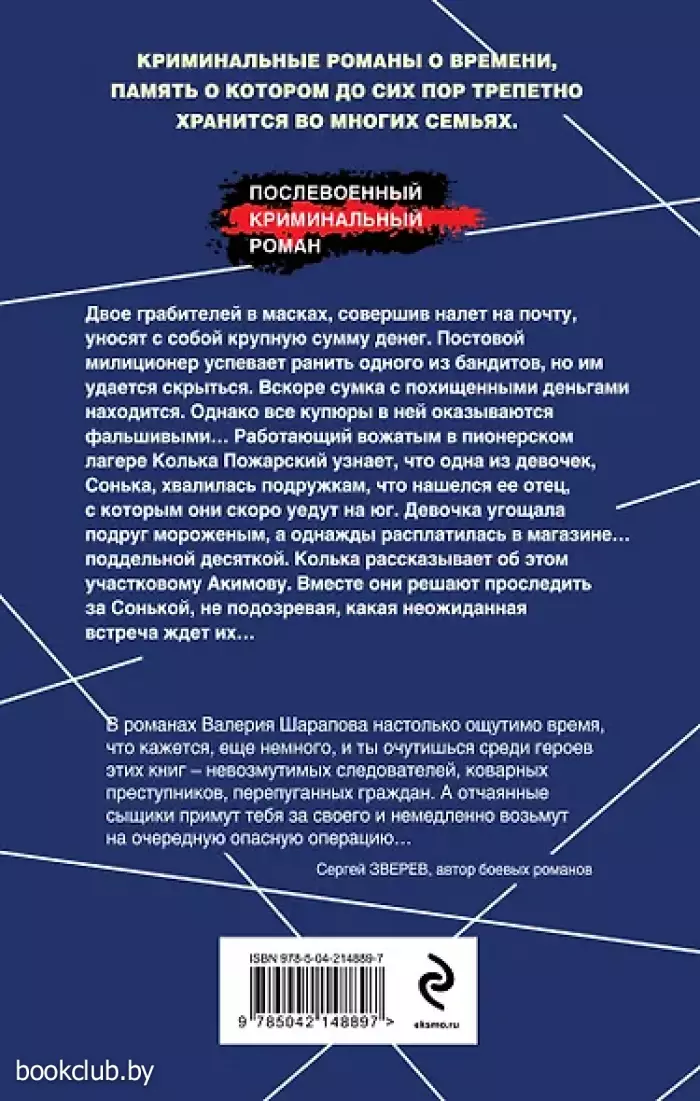 «В романах Валерия Шарапова настолько ощутимо время, что, кажется, еще немного, и ты очутишься среди героев этих книг — невозмутимых следователей, коварных преступников, перепуганных граждан. А отчаянные сыщики примут тебя за своего и немедленно возьмут на очередную опасную операцию…» — Сергей ЗВЕРЕВ, автор боевых романов