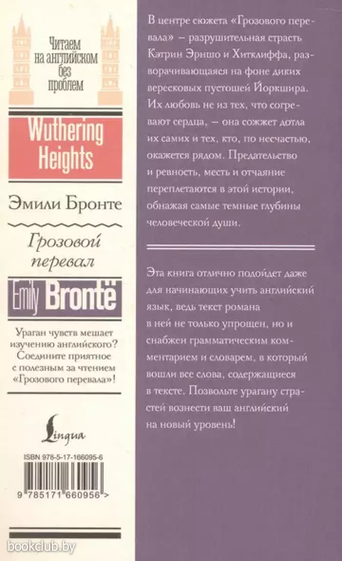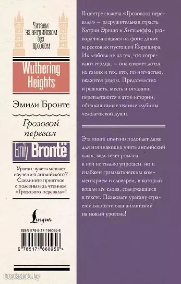 В центре сюжета «Грозового перевала» Эмили Бронте — разрушительная страсть Кэтрин Эрншо и Хитклиффа, разворачивающаяся на фоне диких вересковых пустошей Йоркшира. Их любовь не из тех, что согревают сердца — она сожжет дотла их самих и тех, кто по несчастью окажется рядом. Предательство и ревность, месть и отчаяние переплетаются в этой истории, обнажая самые тёмные глубины человеческой души. Готовы ли вы испытать на себе ярость «Грозового перевала»? Эта книга отлично подойдет даже для начинающих учить английский язык, ведь текст романа в ней не только упрощен, но и снабжен грамматическим комментарием и словарем, в который вошли все слова, содержащиеся в тексте. Позвольте урагану страстей вознести ваш английский на новый уровень!