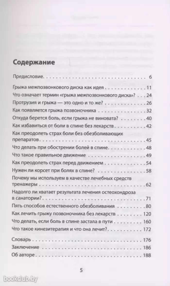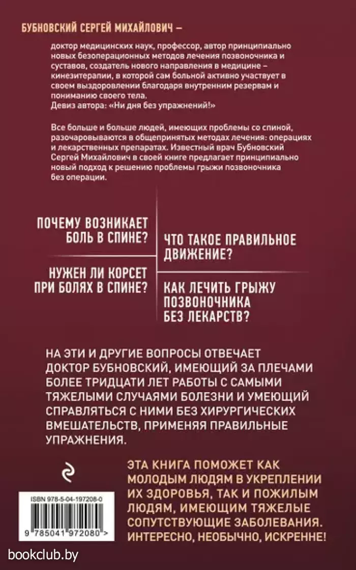Все больше и больше людей, имеющих проблемы со спиной разочаровываются в общепринятых методах лечения: операциях и лекарственных препаратах. Известный врач Бубновский Сергей Михайлович в своей книге предлагает принципиально новый подход к решению проблемы грыжи позвоночника без операции. Что такое боль в спине? Как быть со страхами, возникающими у человека при диагнозе «грыжа позвоночника»? Какой путь выбрать для борьбы с этой проблемой? Нужен ли корсет при болях в спине? Что такое правильное движение? Как преодолеть страх перед движением? Как лечить грыжу позвоночника без лекарств? На эти и другие вопросы отвечает доктор Бубновский, имеющий за плечами более тридцати лет работы с самыми тяжелыми случаями болезни и умеющий справляться с ними без хирургических вмешательств, применяя правильные упражнения. Эта книга поможет как молодым людям в укреплении их здоровья, так и пожилым людям, имеющим тяжелые сопутствующие заболевания. Интересно, необычно, искренне!