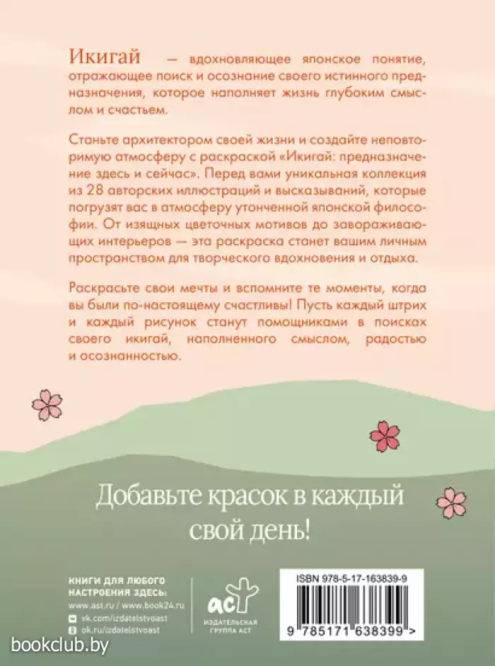 Икигай — вдохновляющее японское понятие, отражающее поиск и осознание своего истинного предназначения, которое наполняет жизнь глубоким смыслом и счастьем. Станьте архитектором своей жизни и создайте неповторимую атмосферу с раскраской «Икигай: предназначение здесь и сейчас». Перед вами уникальная коллекция из 28 авторских иллюстраций и высказываний, которые погрузят вас в атмосферу утонченной японской философии. От изящных цветочных мотивов до завораживающих интерьеров — эта раскраска станет вашим личным пространством для творческого вдохновения и отдыха. Раскрасьте свои мечты и вспомните те моменты, когда вы были по-настоящему счастливы! Пусть каждый штрих и каждый рисунок станут помощниками в поисках своего икигай, наполненного смыслом, радостью и осознанностью. Добавьте красок в каждый свой день!