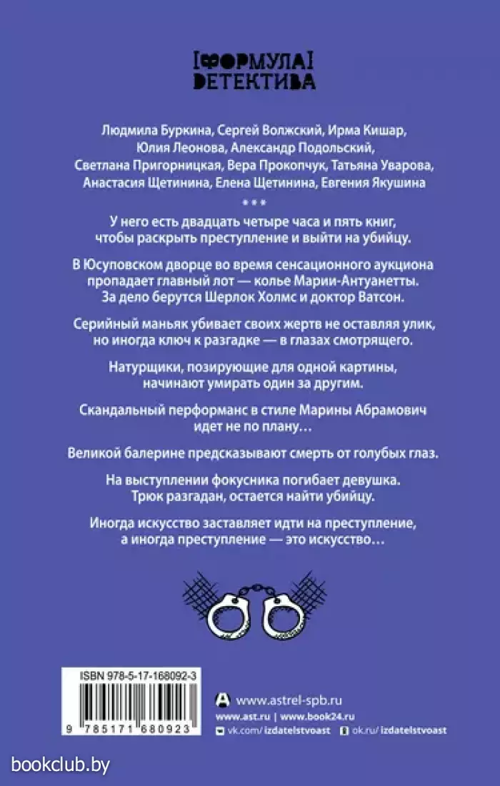 У него есть двадцать четыре часа и пять книг, чтобы раскрыть преступление и выйти на убийцу. В Юсуповском дворце во время сенсационного аукциона пропадает главный лот – колье Марии-Антуанетты. За дело берутся Шерлок Холмс и доктор Ватсон. Серийный маньяк убивает своих жертв не оставляя улик, но иногда ключ к разгадке – в глазах смотрящего. Натурщики, позирующие для одной картины, начинают умирать один за другим. Скандальный перформанс в стиле Марины Абрамович идет не по плану… Великой балерине предсказывают смерть от голубых глаз. На выступлении фокусника погибает девушка. Трюк разгадан, остается найти убийцу. Иногда искусство заставляет идти на преступление, а иногда преступление – это искусство….