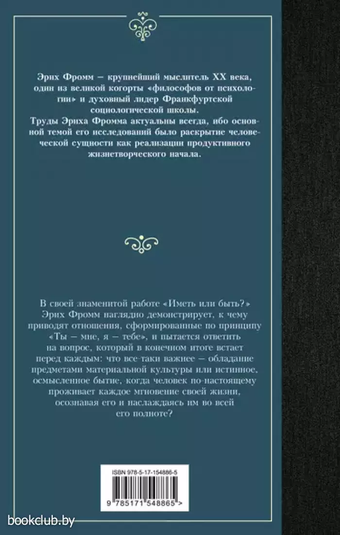 В своей знаменитой работе "Иметь или быть?" Эрих Фромм наглядно демонстрирует, к чему приводят отношения, сформированные по принципу "Ты – мне, я – тебе", и пытается ответить на вопрос, который в конечном итоге встает перед каждым: что все-таки важнее – обладание предметами материальной культуры или истинное, осмысленное бытие, когда человек по-настоящему проживает каждое мгновение своей жизни, осознавая его и наслаждаясь им во всей его полноте?