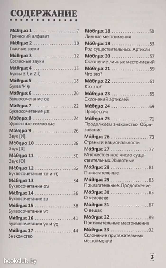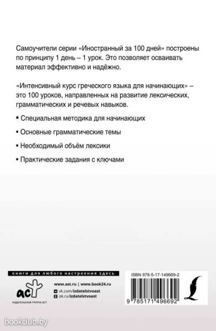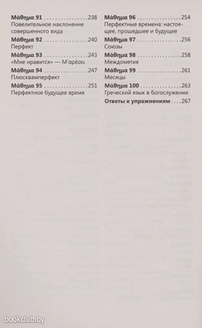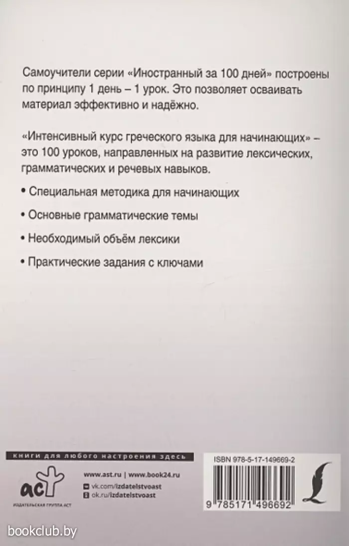 Данное учебное пособие содержит лексический и грамматический материал для изучения греческого языка с нулевого уровня. Курс разделен на 100 относительно небольших, но насыщенных уроков и рассчитан на прохождение в течение 100 дней, то есть на освоение 1 урока потребуется 1 день. Для отработки языковых навыков и речевых умений предлагается большое количество упражнений, ключи к которым расположены в конце книги.