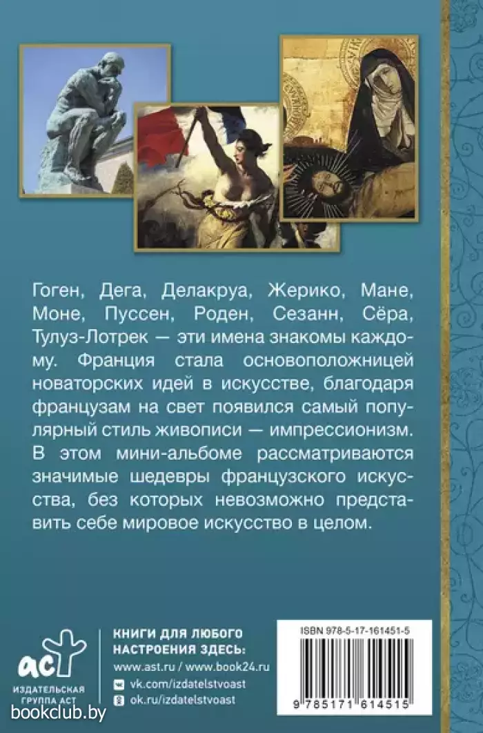 К искусству во Франции всегда относились серьезно, что неудивительно, ведь территория этого государства уже с первобытных времен была сердцем европейской культуры. Красота, чувства, любовь, романтика, революционные настроения, победа, триумф — французские шедевры наполнены всеми красками жизни и в полной мере отражают многоликую историю страны. Из этого альбома вы узнаете о французском изобразительном искусстве, а также проследите его развитие на протяжении веков.