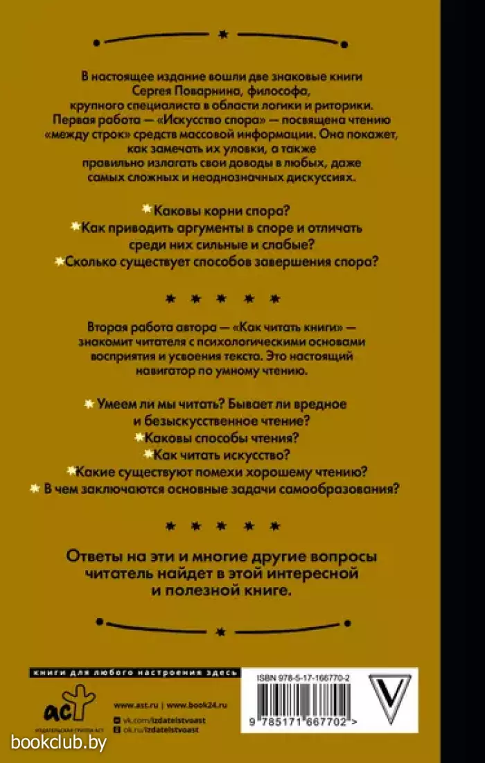 В настоящее издание вошли две знаковые книги Сергея Поварнина, философа, крупного специалиста в области логики и риторики. Первая работа — «Искусство спора» — посвящена чтению «между строк» средств массовой информации. Она покажет, как замечать их уловки, а также правильно излагать свои доводы в любых, даже самых сложных и неоднозначных дискуссиях. Каковы корни спора? Как приводить аргументы в споре и отличать среди них сильные и слабые? Сколько существует способов завершения спора? Вторая работа автора — «Как читать книги» — знакомит читателя с психологическими основами восприятия и усвоения текста. Это настоящий навигатор по умному чтению. Умеем ли мы читать? Бывает ли вредное и безыскусственное чтение? Каковы способы чтения? Как читать искусство? Какие существуют помехи хорошему чтению? В чем заключаются основные задачи самообразования? Ответы на эти и многие другие вопросы читатель найдет в этой интересной и полезной книге.