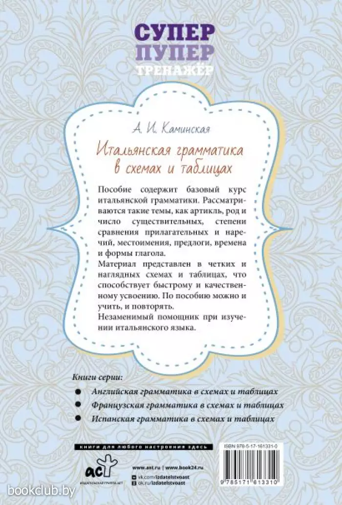 Издание предназначено для всех, кто учит итальянский язык. Книга от издательства «АСТ», входящая в серию «Суперпупертренажер», принесет массу положительных впечатлений от прочтения и займет достойное место в вашей библиотеке. Для вашего удобства при оформлении заказа по телефону назовите код товара: 403725