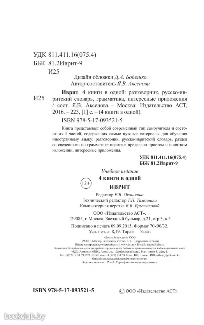 Книга «Иврит. 4 книги в одной: разговорник, русско-ивритский словарь, грамматика, интересные приложения» - станет прекрасным дополнением вашей библиотеки. Для вашего удобства при оформлении заказа по телефону назовите код товара: 109517