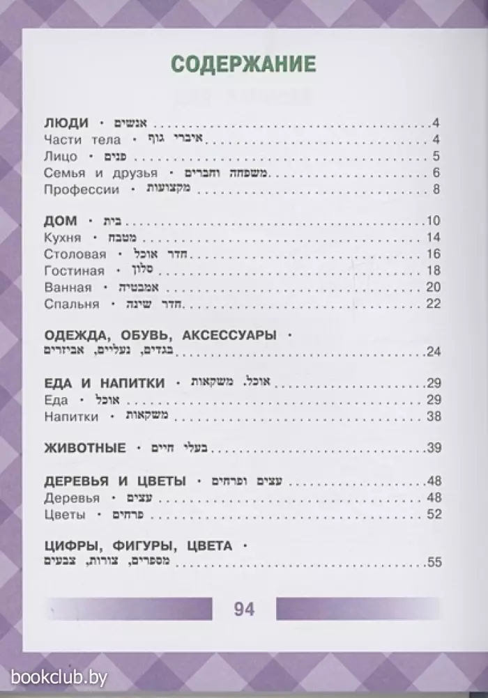 Книга представляет собой детский тематический словарь, в котором более 400 слов на иврите, разделенных на 17 интересных для детей тем и сопровождающихся яркими и красивыми иллюстрациями, а также переводом и транскрипцией русскими буквами.