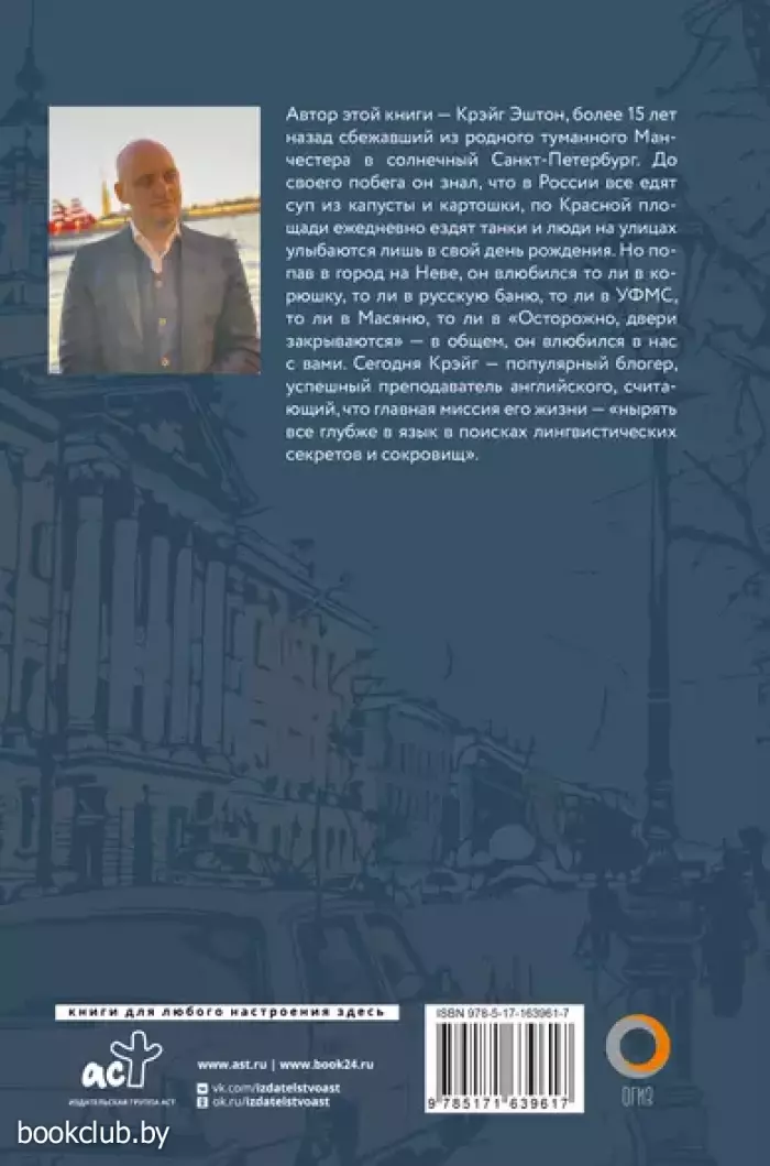 Автор этой книги — Крэйг Эштон, более 15 лет назад сбежавший из родного туманного Манчестера в солнечный Санкт-Петербург. До своего побега он знал, что в России все едят суп из капусты и картошки, по Красной площади ежедневно ездят танки и люди на улицах улыбаются лишь в свой день рождения. Но попав в город на Неве, он влюбился то ли в корюшку, то ли в русскую баню, то ли в УФМС, то ли в Масяню, то ли в «Осторожно, двери закрываются» — в общем, он влюбился в нас с вами. Сегодня Крэйг — популярный блогер, успешный преподаватель английского, считающий, что главная миссия его жизни — «нырять все глубже в язык в поисках лингвистических секретов и сокровищ».