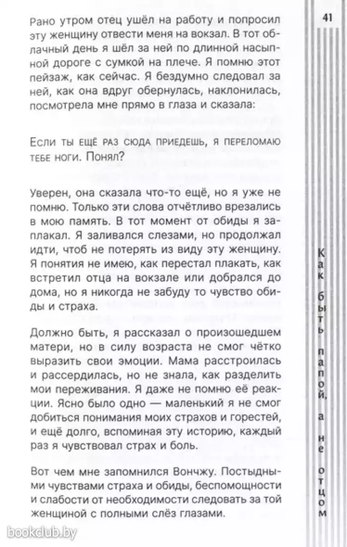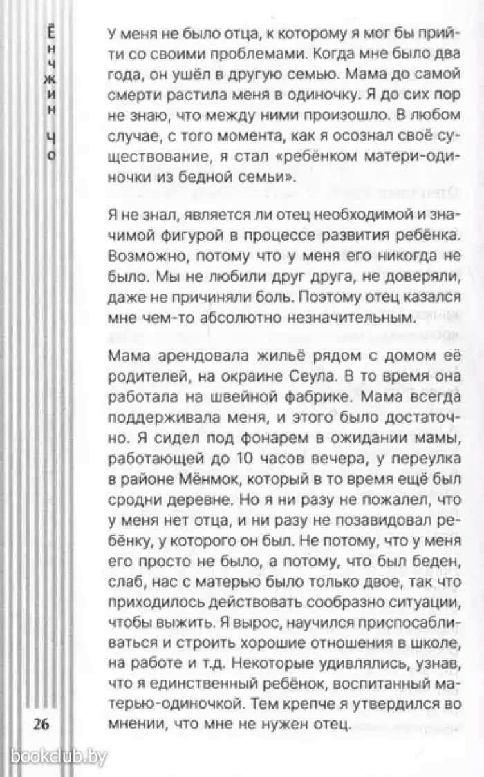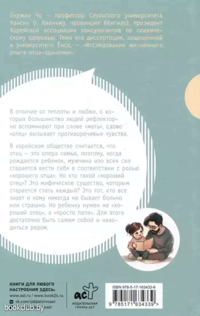 В отличие от теплоты и любви, о которых большинство людей рефлекторно вспоминают при слове «мать», слово «отец» вызывает противоречивые чувства. В корейском обществе считается, что отец — это опора семьи, поэтому, когда рождается ребенок, мужчина изо всех сил старается вести себя в соответствии с ролью «хорошего отца». Но кто такой «хороший отец»? Это мифическое существо, которым старается стать каждый? Это тот, кто все знает, и кому никогда не бывает больно или страшно. Но ребенку нужен не «хороший отец», а «просто папа». Для этого достаточно быть самим собой и находиться рядом.
