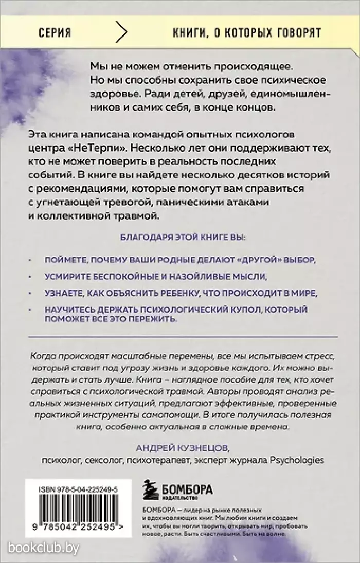Эта книга написана командой опытных психологов Центра «НеТерпи». Несколько лет они поддерживают тех, кто не может поверить в реальность последних событий. В книге вы найдете несколько десятков историй с рекомендациями, которые помогут вам справиться с угнетающей тревогой, паническими атаками и коллективной травмой.