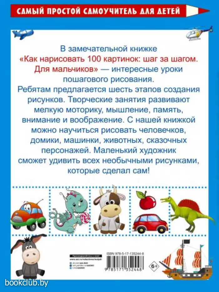 Под обложкой книги «Как нарисовать 100 картинок для мальчиков: шаг за шагом» — коллекция пошаговых рисовалок и раскрасок для мальчиков. Книжка обязательно понравится юным художникам и маленьким фантазёрам и поможет им освоить искусство рисования с легкостью и увлечением. Творческие занятия не только приносят удовольствие, но и способствуют развитию интеллекта и творческого мышления у детей.
