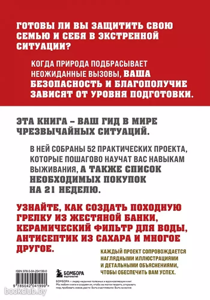 Эта книга – ваш гид в мире чрезвычайных ситуаций. В ней собраны 52 практических проекта, которые пошагово научат вас навыкам выживания, а также список необходимых покупок на 21 неделю. Узнайте, как создать походную грелку из жестяной банки, керамический фильтр для воды, антисептик из сахара и многое другое. Не откладывайте вашу безопасность на потом!