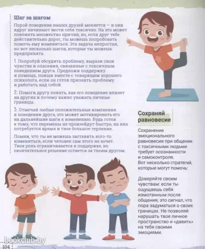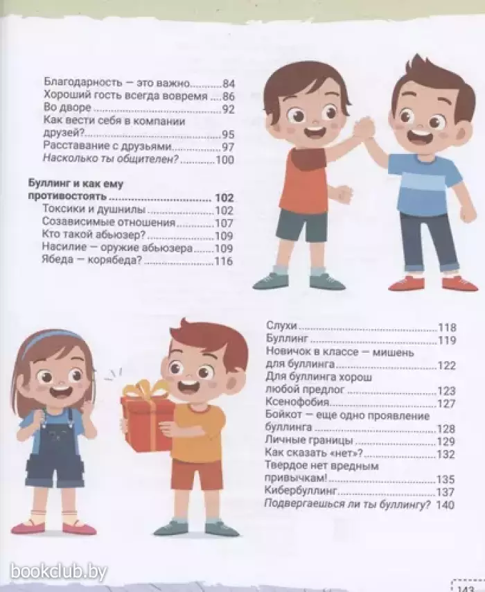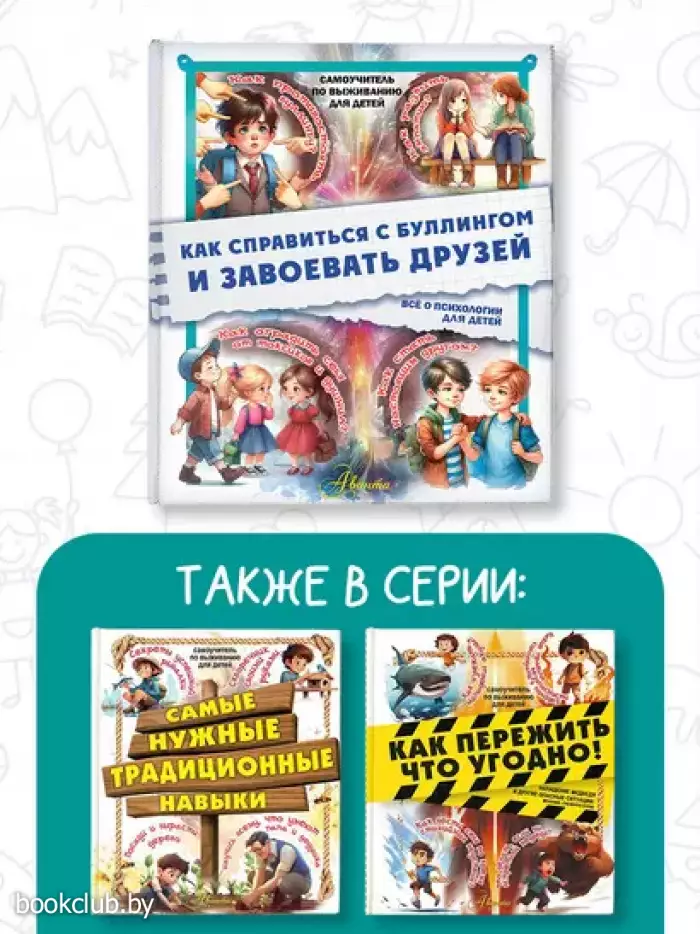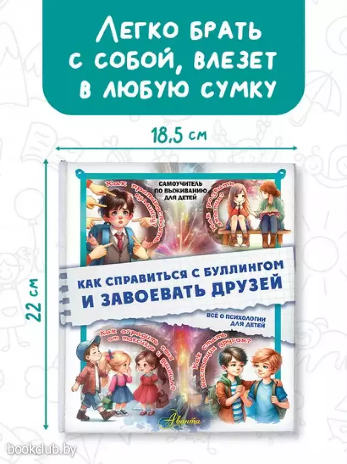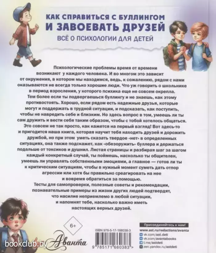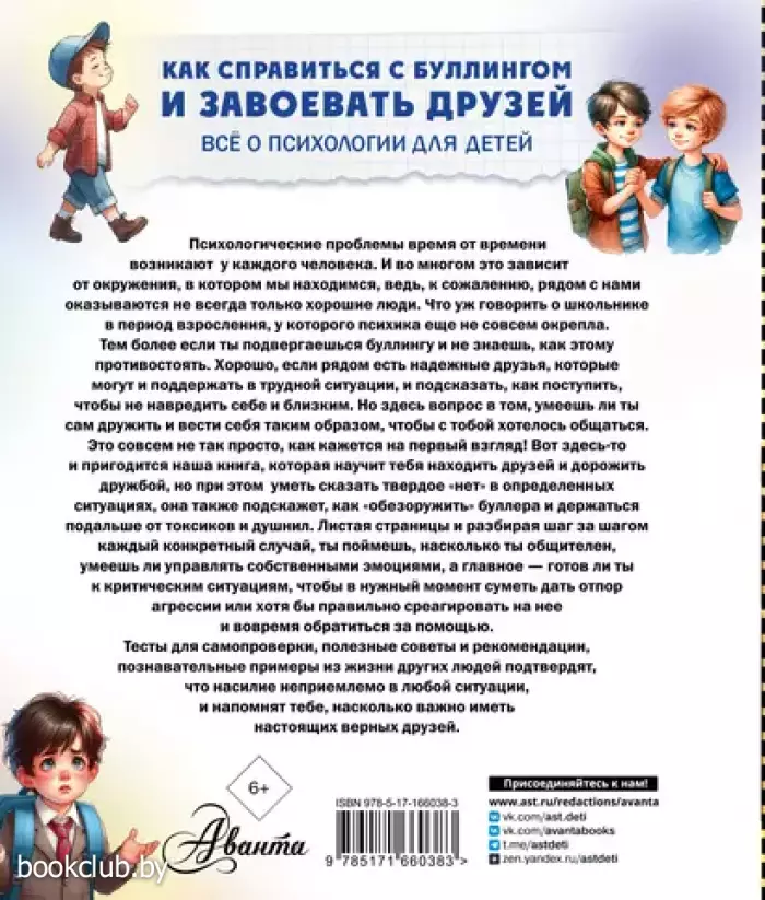 Буллинг — это когда кто-то обижает других словами или поступками. Такое может произойти в школе, на улице и даже дома. Самое важное, что нужно помнить: ты не одинок и, к сожалению, далеко не единственный человек, который попадает в подобную ситуацию. Как распознать буллинг? Как защищать себя и других во время агрессии? Как «обезоружить» буллера? Как избежать общения с токсиками и душнилами? Как управлять своими эмоциями? Как создать настроение? Как выработать силу воли? Как обрести верных друзей? Как стать добрым и отзывчивым человеком? Ответы на эти и множество других важных вопросов, касающихся взаимодействия со сверстниками и взрослыми, ты найдешь в данной книге — своем путеводителе в мире дружбы и взаимопонимания с другими людьми. Советы, упражнения и тесты помогут тебе не только справиться с буллингом, агрессией и насилием, но и разобраться в себе, своих эмоциях и научиться завоевывать друзей. Для среднего школьного возраста.