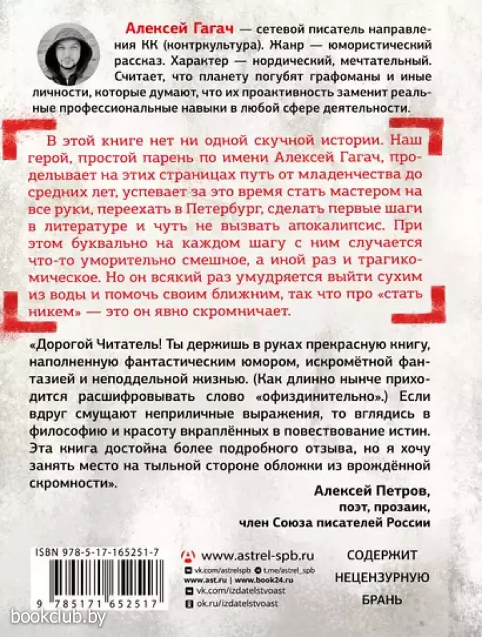 В этой книге нет ни одной скучной истории. Наш герой, простой парень по имени Алексей Гагач, проделывает на этих страницах путь от младенчества до средних лет, успевает за это время стать мастером на все руки, переехать в Петербург, сделать первые шаги в литературе и чуть не вызвать апокалипсис. При этом буквально на каждом шагу с ним случается что-то уморительно смешное, а иной раз и трагикомическое. Но он всякий раз умудряется выйти сухим из воды и помочь своим ближним, так что про «стать никем» — это он явно скромничает.
