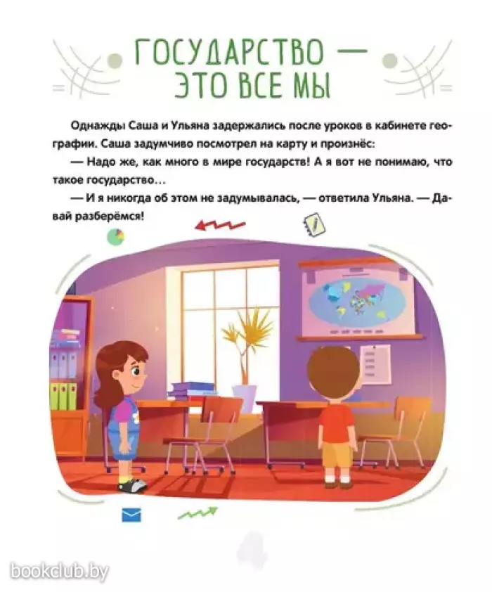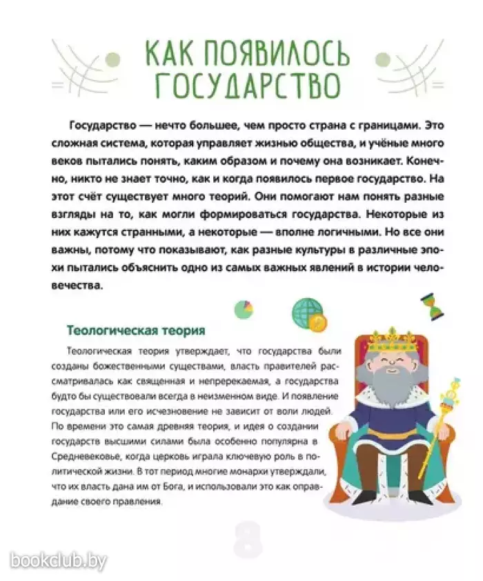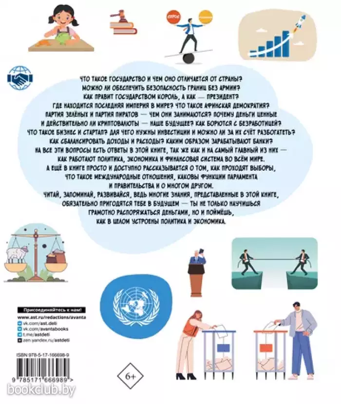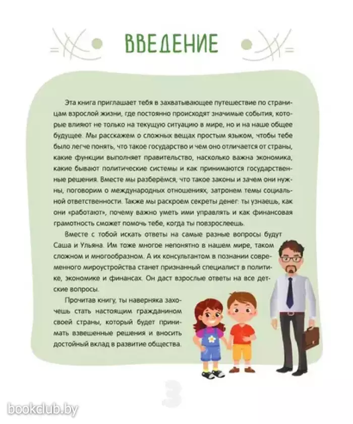 Дорогие родители! Наверняка вы хотите, чтобы ваш ребёнок рос всесторонне развитым и образованным, уверенно ориентировался в таком огромном и разнообразном мире, политическое и экономическое устройство которого — неотъемлемая часть самого существования человеческой цивилизации. Порой постигнуть многие вопросы политики и экономики, финансовые процессы нелегко даже взрослому, здесь же мы простым и понятным языком познакомим маленьких читателей со сложными вещами, о которых они постоянно задают вопросы. Рассматриваемые темы на первый взгляд могут показаться скучными, но здесь они раскрываются увлекательно и очень доступно для детей. Путешествуя по страницам книги, они познакомятся с ключевыми понятиями государственного устройства, научатся понимать разницу между различными политическими системами, изучат основные правила государственного управления. Это поможет им построить собственное представление о том, как действует мир политики и как они сами могут влиять на него. Другой важной частью книги является анализ экономических и финансовых процессов. Дети узнают, как функционируют рынок, биржа, банковская система, познакомятся с понятиями спроса и предложения, инфляции, инвестиций. Это даст им возможность сформировать собственное понимание ценностей, денежной системы и важности финансовой грамотности.