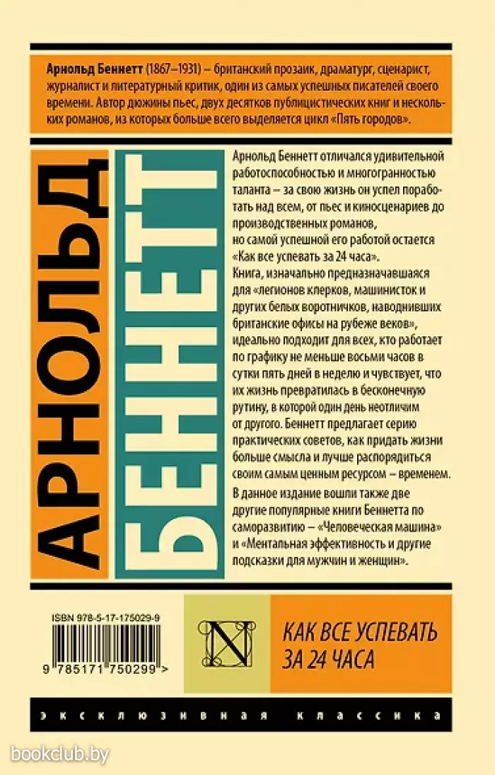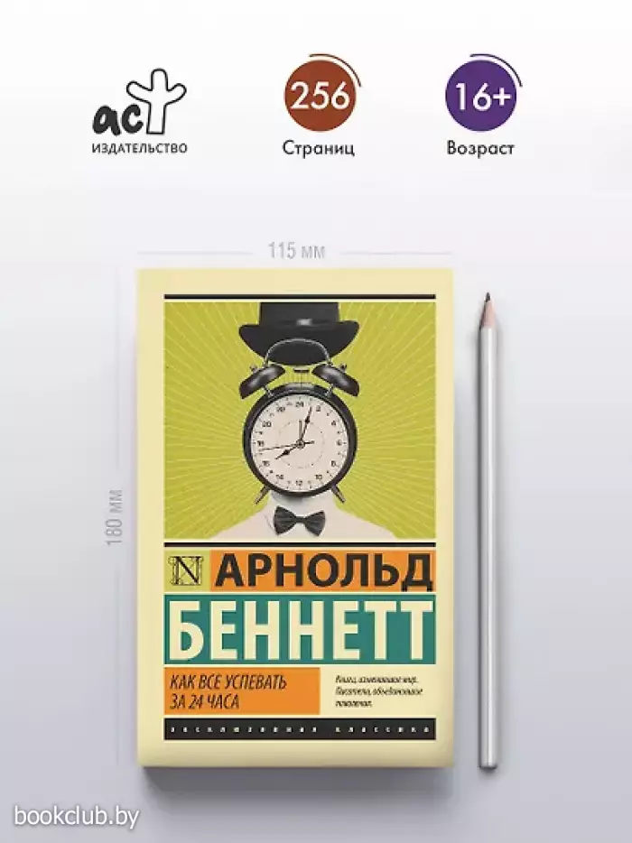 – «Как все успевать за 24 часа» Арнольда Беннетта — книга о саморазвитии, личной эффективности и тайм-менеджменте. Впервые опубликованная в начале XX века, мгновенно завоевала популярность среди офисных работников и остается востребованной и сегодня.