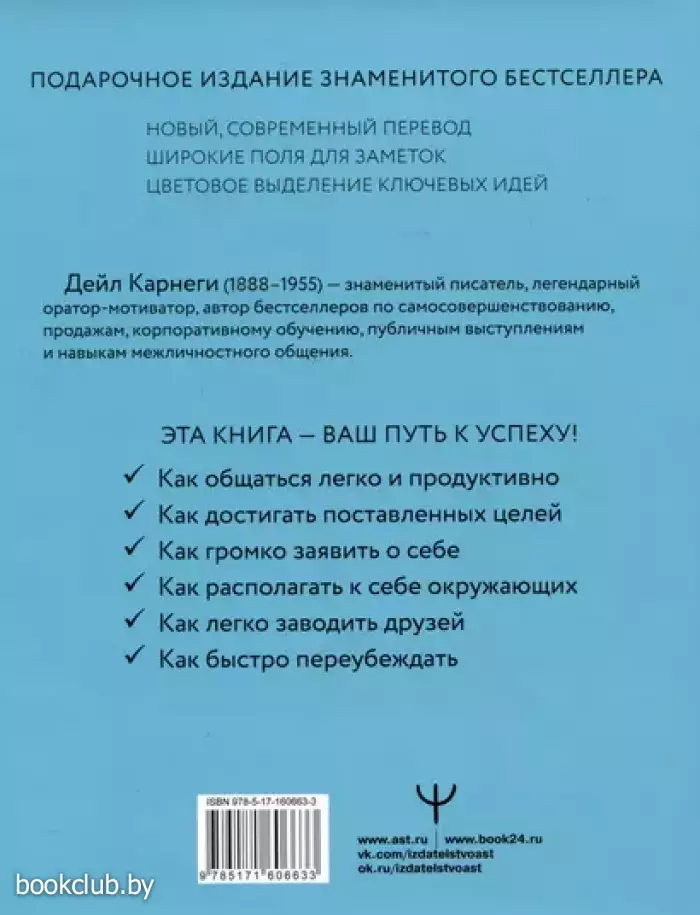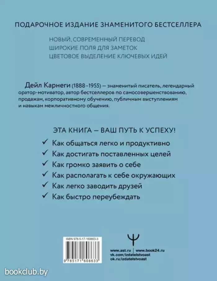 Надежные, проверенные опытом и временем советы Карнеги остаются актуальными для современного читателя, поскольку автор обращается к вечным вопросам об искусстве ладить с людьми. Этот бестселлер в новом, современном, полном переводе передает важнейшие жизненные уроки посредством увлекательного повествования, показывая читателям, как стать теми, кем они хотят быть.