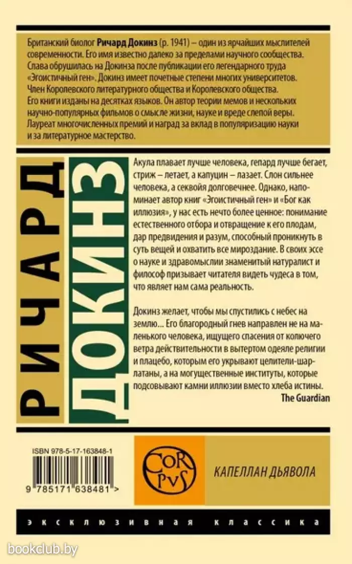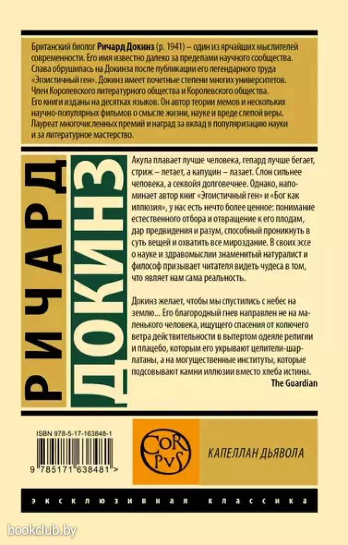 Акула плавает лучше человека, гепард лучше бегает, стриж лучше его летает, а капуцин — лазает. Слон сильнее человека, а секвойя — долговечнее. Однако, напоминает автор книг “Эгоистичный ген” и “Бог как иллюзия”, у нас есть нечто гораздо более ценное: понимание естественного отбора и отвращение к его плодам, дар предвидения и разум, способный проникнуть в суть вещей и охватить все мироздание. В своих эссе о науке, религии и здравомыслии знаменитый натуралист и философ призывает читателя оставить иллюзии и видеть чудеса в том, что являет нам сама реальность.