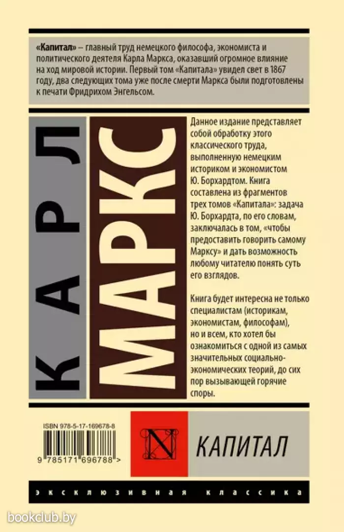 Данное издание представляет собой обработку этого классического труда, выполненную немецким историком и экономистом Ю. Борхардтом. Книга составлена из фрагментов трех томов "Капитала": задача Ю. Борхардта, по его словам, заключалась в том, "чтобы предоставить говорить самому Марксу" и дать возможность любому читателю понять суть его взглядов