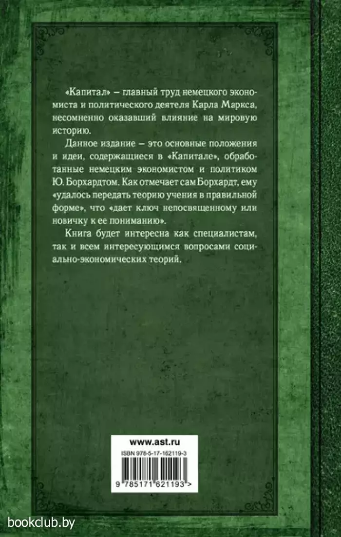 "Капитал" – главный труд немецкого экономиста и политического деятеля Карла Маркса, несомненно, оказавший влияние на мировую историю. Данное издание – это основные положения и идеи содержащиеся в "Капитале", обработанные немецким экономистом и политиком Ю. Борхардтом. Как отмечает сам Борхардт, ему "удалось передать теорию учения в правильной форме", что "дает ключ непосвященному или новичку к ее пониманию". Книга будет интересна как специалистам, так и всем интересующимся вопросами социально-экономических теорий.